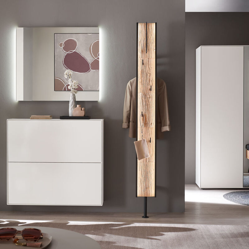 Ausdrucksstarke Hirnholz-Applikationen mit individuellen Rissen und Merkmalen verleihen dem Garderoben-Programm CAYA seinen einzigartigen Charakter...