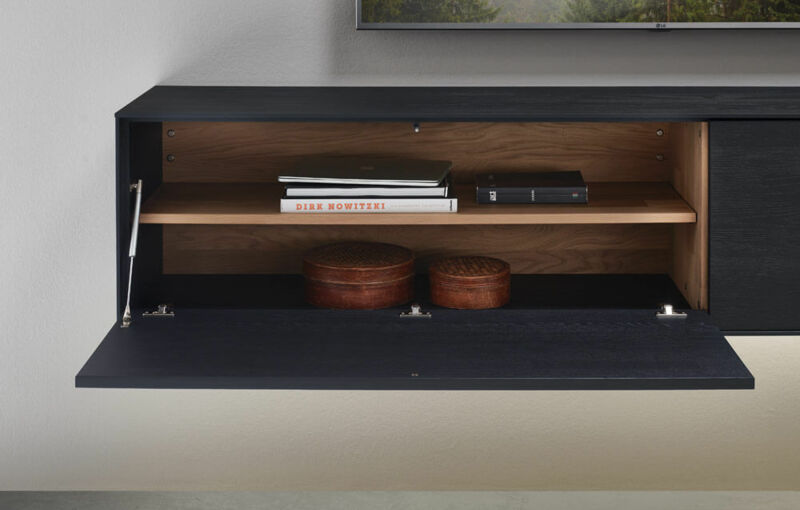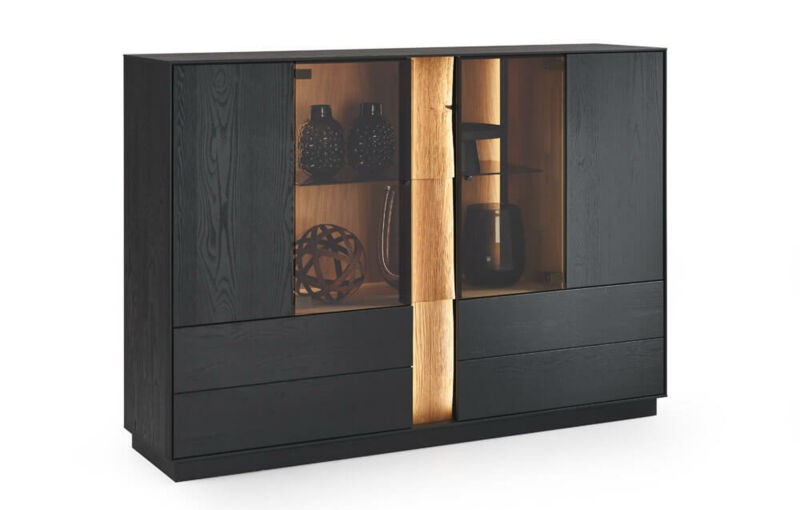 Durch die warme Beleuchtung erhalten die Eichenholzschindeln eine besondere Kraft, die vor allem durch die Kombination mit anthrazit gebeiztem Eschenholz, Metallelementen und Glas optimal zur Geltung kommt.