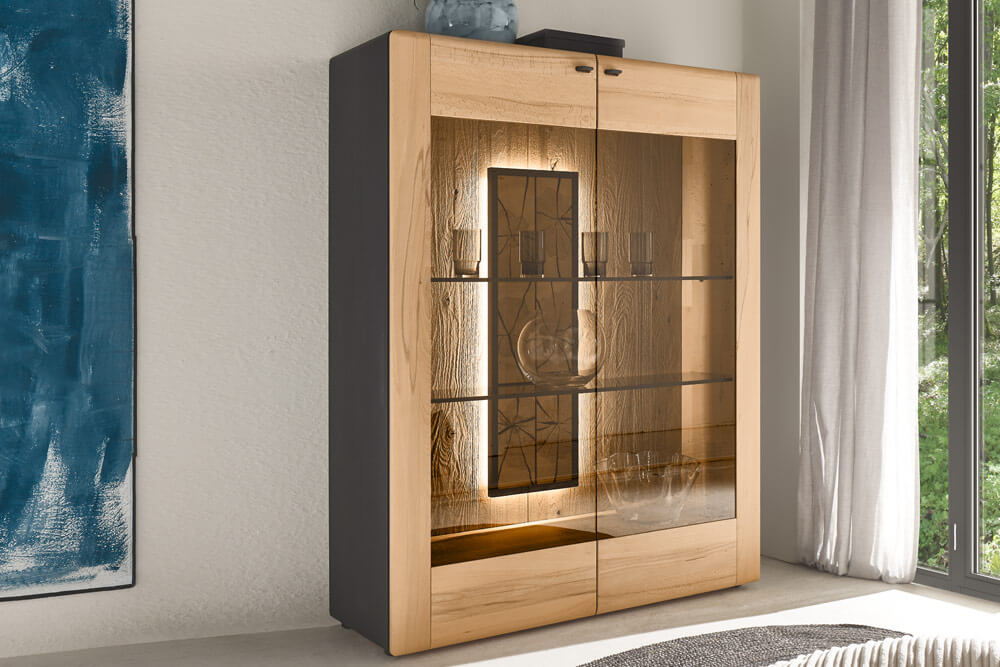 Die markanten Hirnholzscheiben kommen dank des Akzentrahmens in Anthrazit noch stärker zur Geltung und der Massivholzcharakter