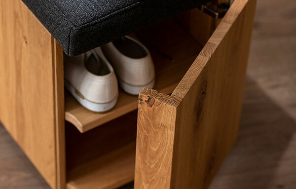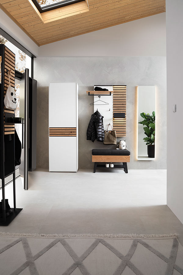 Tatsache ist, dass YONNA für Ordnung und Aufmerksamkeit sorgt. Egal wer raus oder rein geht, der Blick fällt unweigerlich auf die Details der Garderobe. Pulverbeschichtete Metallelemente in Anthrazit, großzügige Spiegel und die indirekte Beleuchtung machen aus einzelnen Möbeln einen echten Wohnraum im eigenen Zuhause.
